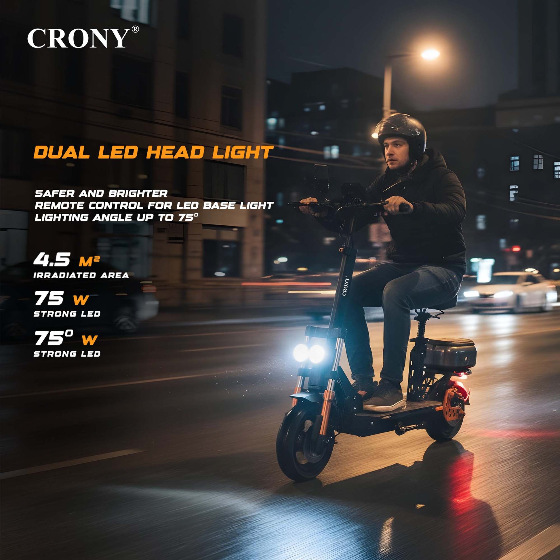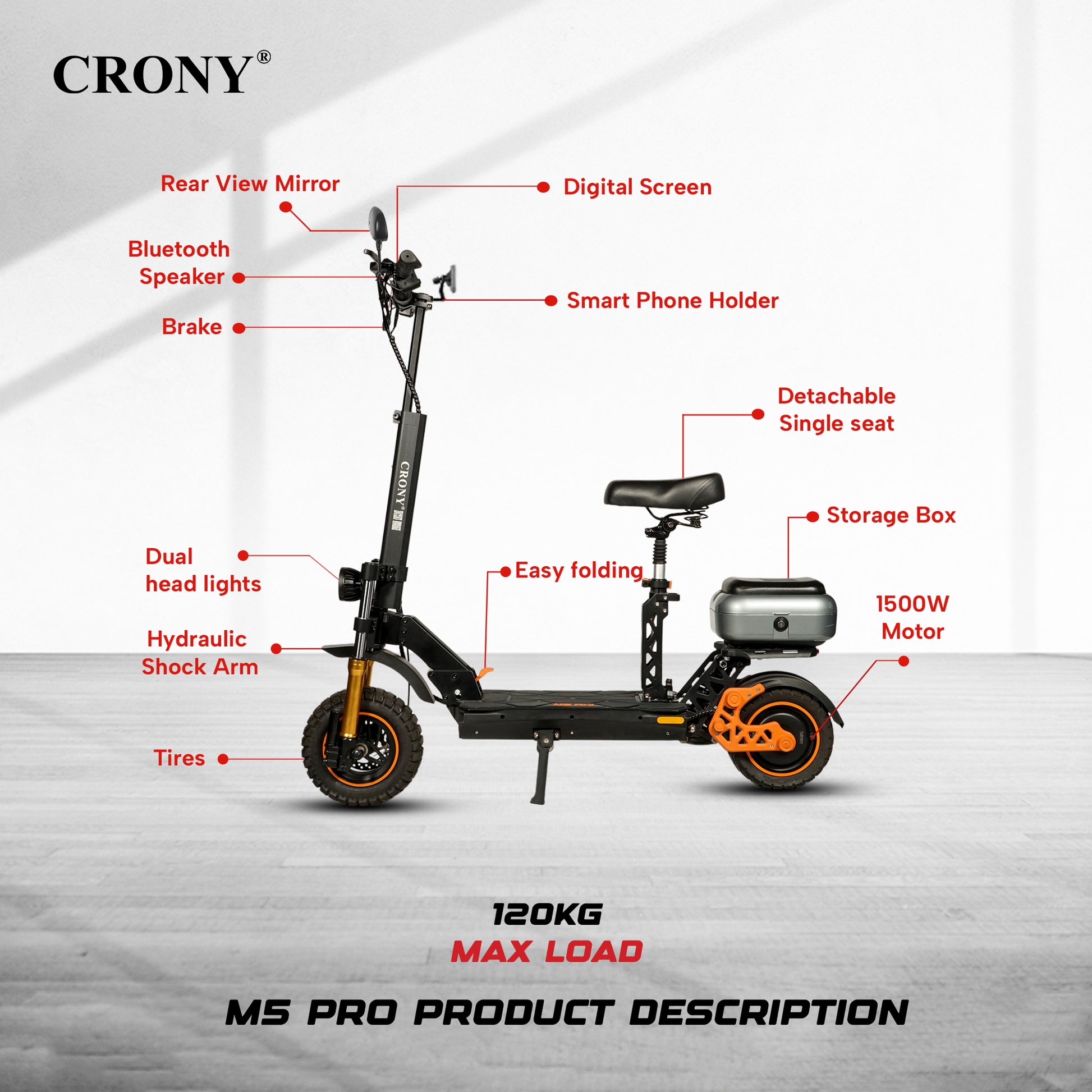 Crony M5 Pro High-Speed Electric Scooter is a powerful and versatile ride. It features durable 10-inch wide tires for stability, a mobile phone holder, and a built-in Bluetooth speaker for a connected and entertaining experience. Practical additions like a rear luggage box, rearview mirrors, dual LED headlamps, and IPX4 waterproofing ensure convenience and safety. With app connectivity for enhanced control, this scooter is the perfect blend of performance, style, and functionality.